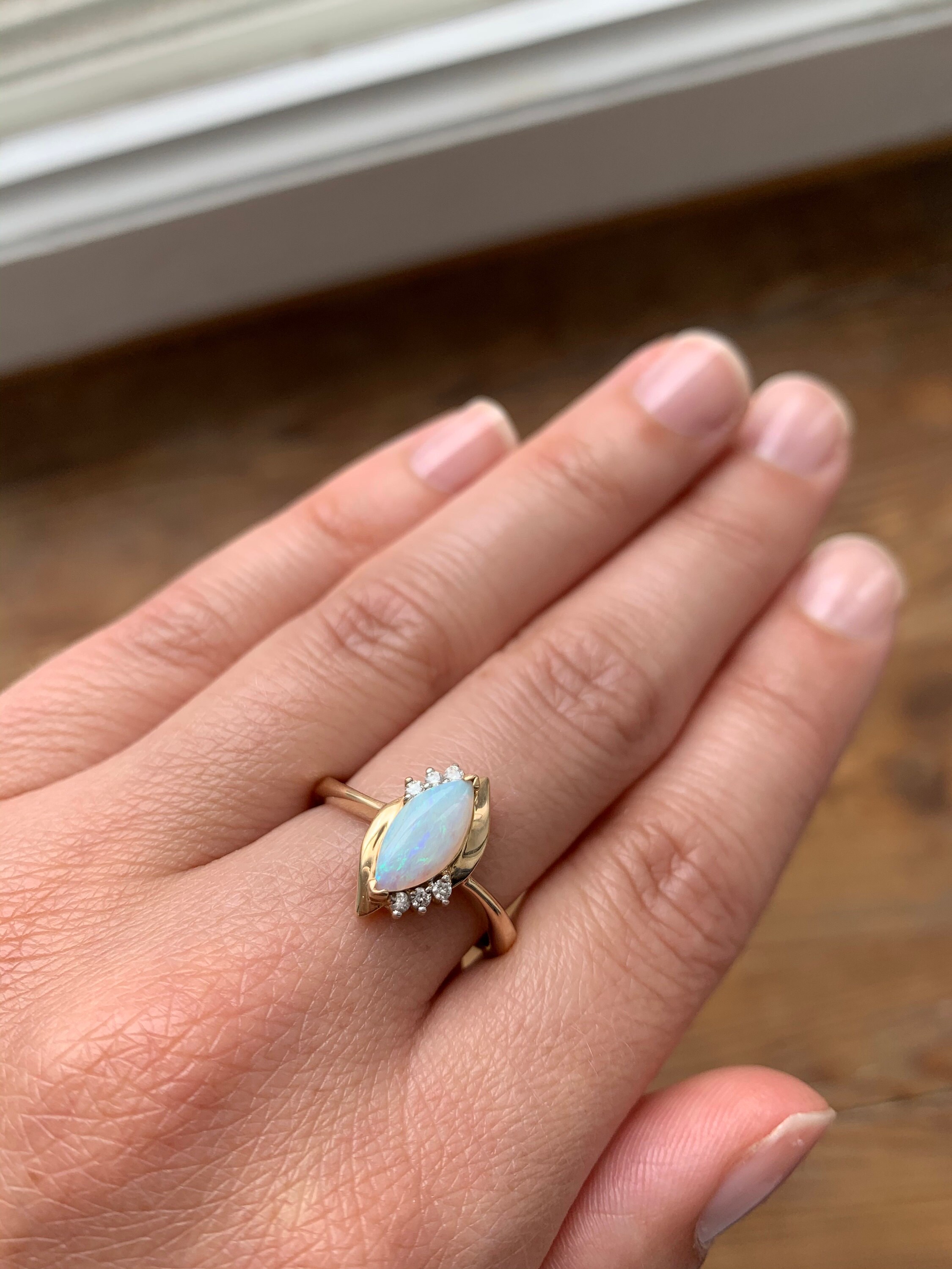 The beautifully coloured Marquise cut Opal measures 10 x 5mm and has 3 sparkling diamonds on each side